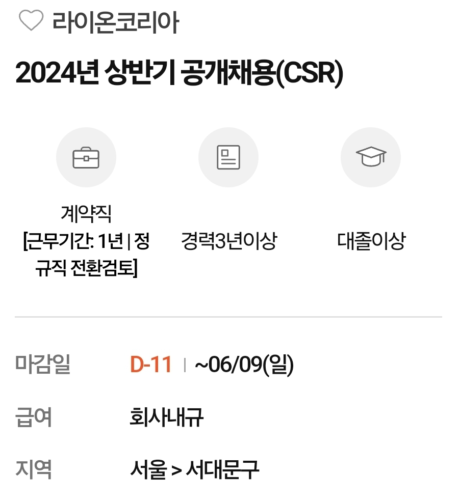 라이온코리아-CSR 담당자 채용 기업 사회공헌 업무 분야로 취업하기는 쉽지 않다. 자리도 많지 않고 정규직이 아닌 계약직인 경우가 많다. 기존 직원들이 사회공헌 업무를 담당하는 경우가 많아 사회복지사를 채용하는 경우가 적다. 또한 채용 경우에도 사회공헌이나 기업과 연관된 업무 경력자를 우선한다. 따라서 최대한 많은 경험을 쌓을수 있도록 준비해야 한다. 이에 기업 사회공헌 분야 채용 사례를 엄선해서 공유하고자 한다. 기업 사회공헌/기업 사회공헌 취업 정보 2024.05.29