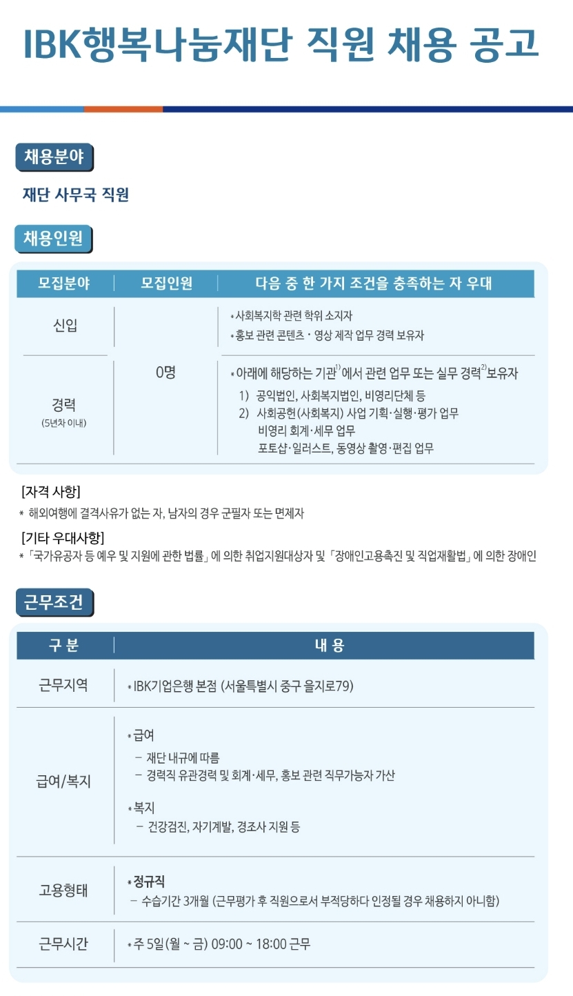 IBK행복나눔재단-직원채용 기업 사회공헌 업무 분야로 취업하기는 쉽지 않다. 자리도 많지 않고 정규직이 아닌 계약직인 경우가 많다. 기존 직원들이 사회공헌 업무를 담당하는 경우가 많아 사회복지사를 채용하는 경우가 적다. 또한 채용 경우에도 사회공헌이나 기업과 연관된 업무 경력자를 우선한다. 따라서 최대한 많은 경험을 쌓을수 있도록 준비해야 한다. 이에 기업 사회공헌 분야 채용 사례를 엄선해서 공유하고자 한다. 기업 사회공헌/기업 사회공헌 취업 정보 2024.04.15