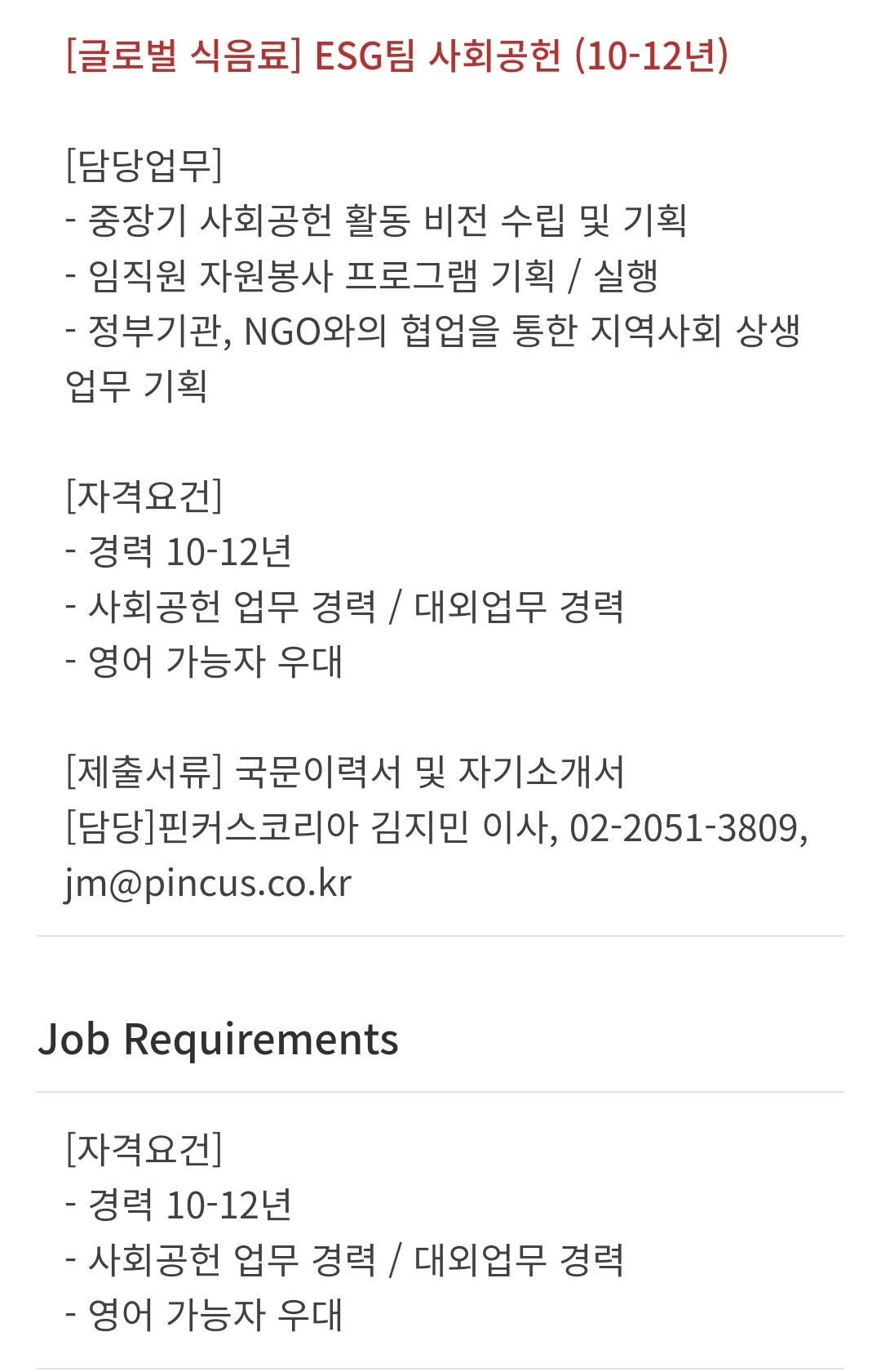 글로벌 식음료 기업 - ESG팀 사회공헌 CSR 경력자 채용 기업 사회공헌 업무 분야로 취업하기는 쉽지 않다. 자리도 많지 않고 정규직이 아닌 계약직인 경우가 많다. 기존 직원들이 사회공헌 업무를 담당하는 경우가 많아 사회복지사를 채용하는 경우가 적다. 또한 채용 경우에도 사회공헌이나 기업과 연관된 업무 경력자를 우선한다. 따라서 최대한 많은 경험을 쌓을수 있도록 준비해야 한다. 이에 기업 사회공헌 분야 채용 사례를 엄선해서 공유하고자 한다. 기업 사회공헌/기업 사회공헌 취업 정보 2024.01.31