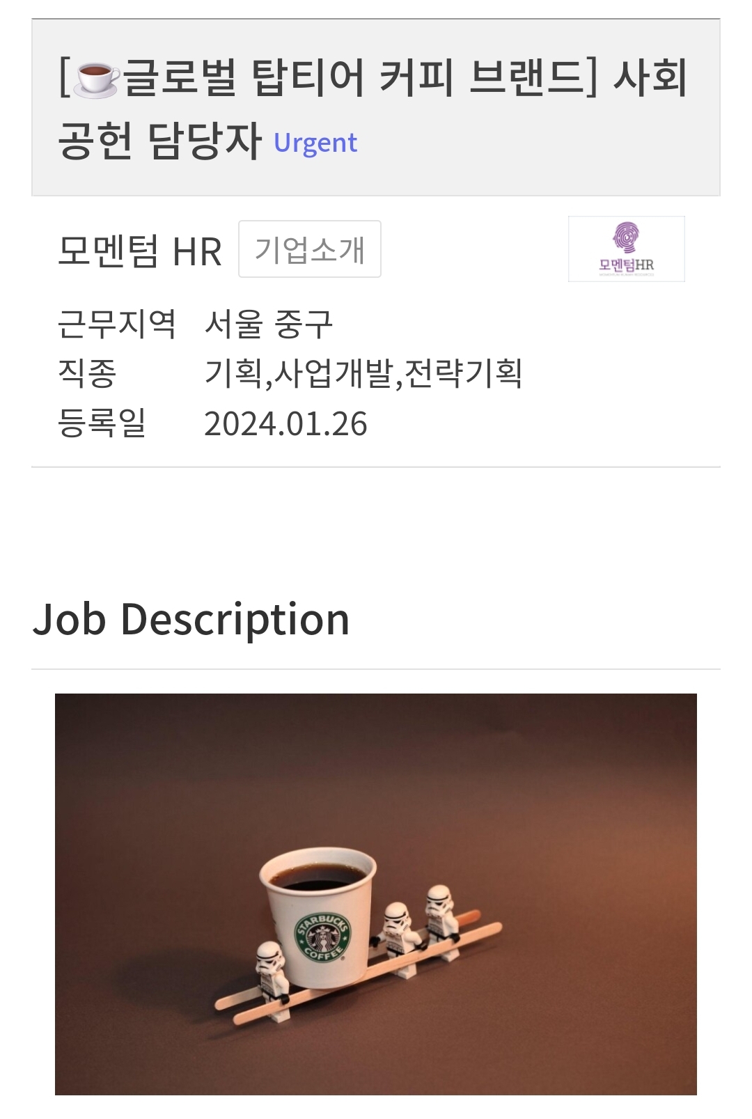 스타벅스 - 사회공헌 CSR 담당자 채용 기업 사회공헌 업무 분야로 취업하기는 쉽지 않다. 자리도 많지 않고 정규직이 아닌 계약직인 경우가 많다. 기존 직원들이 사회공헌 업무를 담당하는 경우가 많아 사회복지사를 채용하는 경우가 적다. 또한 채용 경우에도 사회공헌이나 기업과 연관된 업무 경력자를 우선한다. 따라서 최대한 많은 경험을 쌓을수 있도록 준비해야 한다. 이에 기업 사회공헌 분야 채용 사례를 엄선해서 공유하고자 한다. 기업 사회공헌/기업 사회공헌 취업 정보 2024.02.02