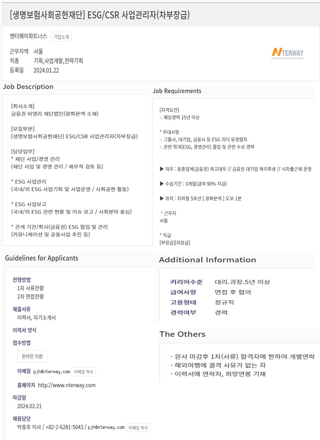 생명보험사회공헌재단 - ESG/CSR 차부장급 채용 기업 사회공헌 업무 분야로 취업하기는 쉽지 않다. 자리도 많지 않고 정규직이 아닌 계약직인 경우가 많다. 기존 직원들이 사회공헌 업무를 담당하는 경우가 많아 사회복지사를 채용하는 경우가 적다. 또한 채용 경우에도 사회공헌이나 기업과 연관된 업무 경력자를 우선한다. 따라서 최대한 많은 경험을 쌓을수 있도록 준비해야 한다. 이에 기업 사회공헌 분야 채용 사례를 엄선해서 공유하고자 한다. 기업 사회공헌/기업 사회공헌 취업 정보 2024.01.27