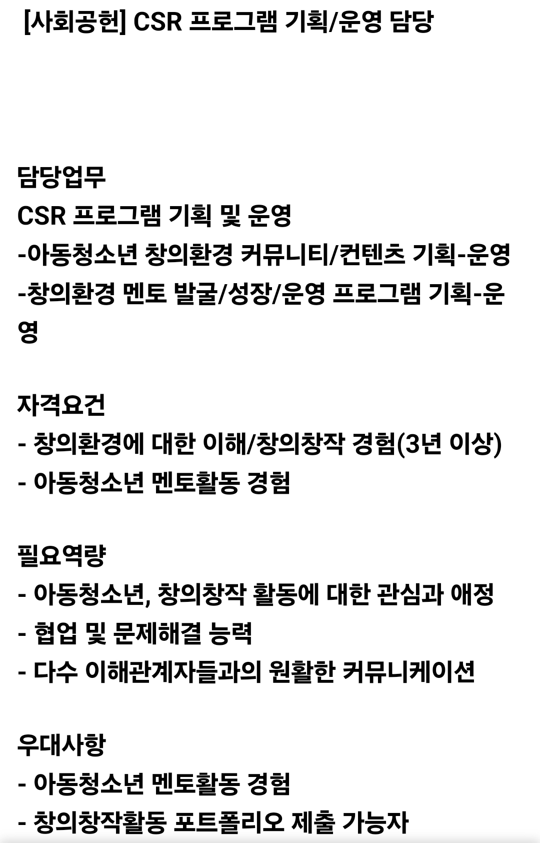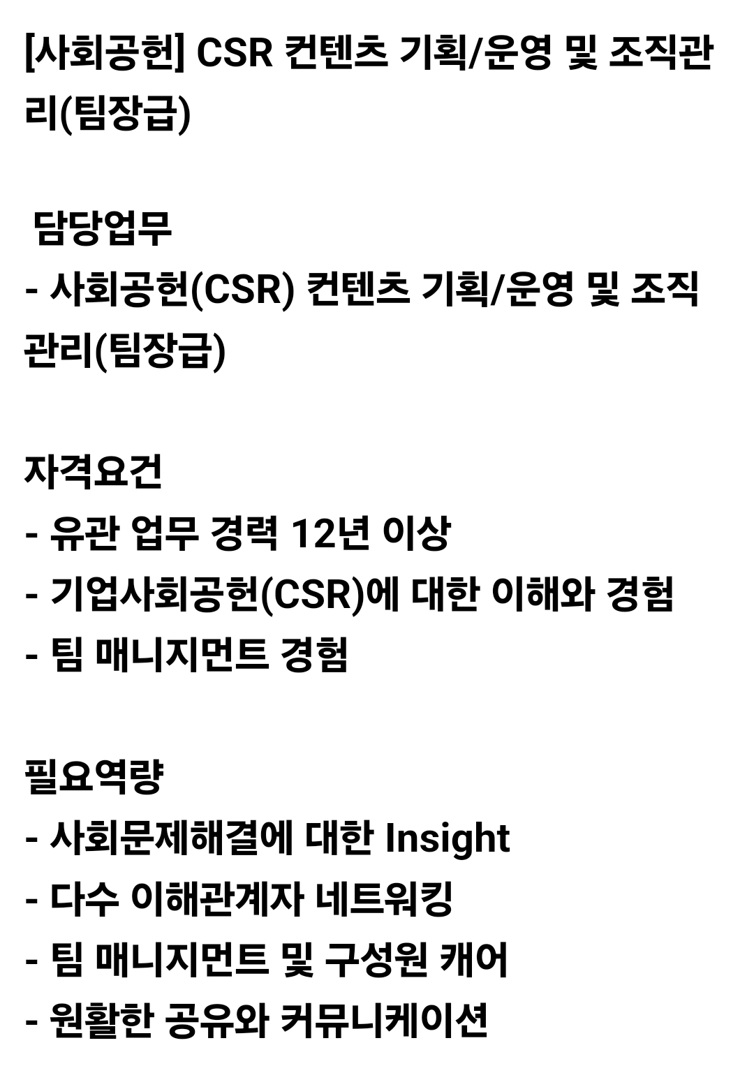 기업 사회공헌 업무 분야로 취업하기는 쉽지 않다. 자리도 많지 않고 정규직이 아닌 계약직인 경우가 많다. 기존 직원들이 사회공헌 업무를 담당하는 경우가 많아 사회복지사를 채용하는 경우가 적다. 또한 채용 경우에도 사회공헌이나 기업과 연관된 업무 경력자를 우선한다. 따라서 최대한 많은 경험을 쌓을수 있도록 준비해야 한다. 이에 기업 사회공헌 분야 채용 사례를 엄선해서 공유하고자 한다.