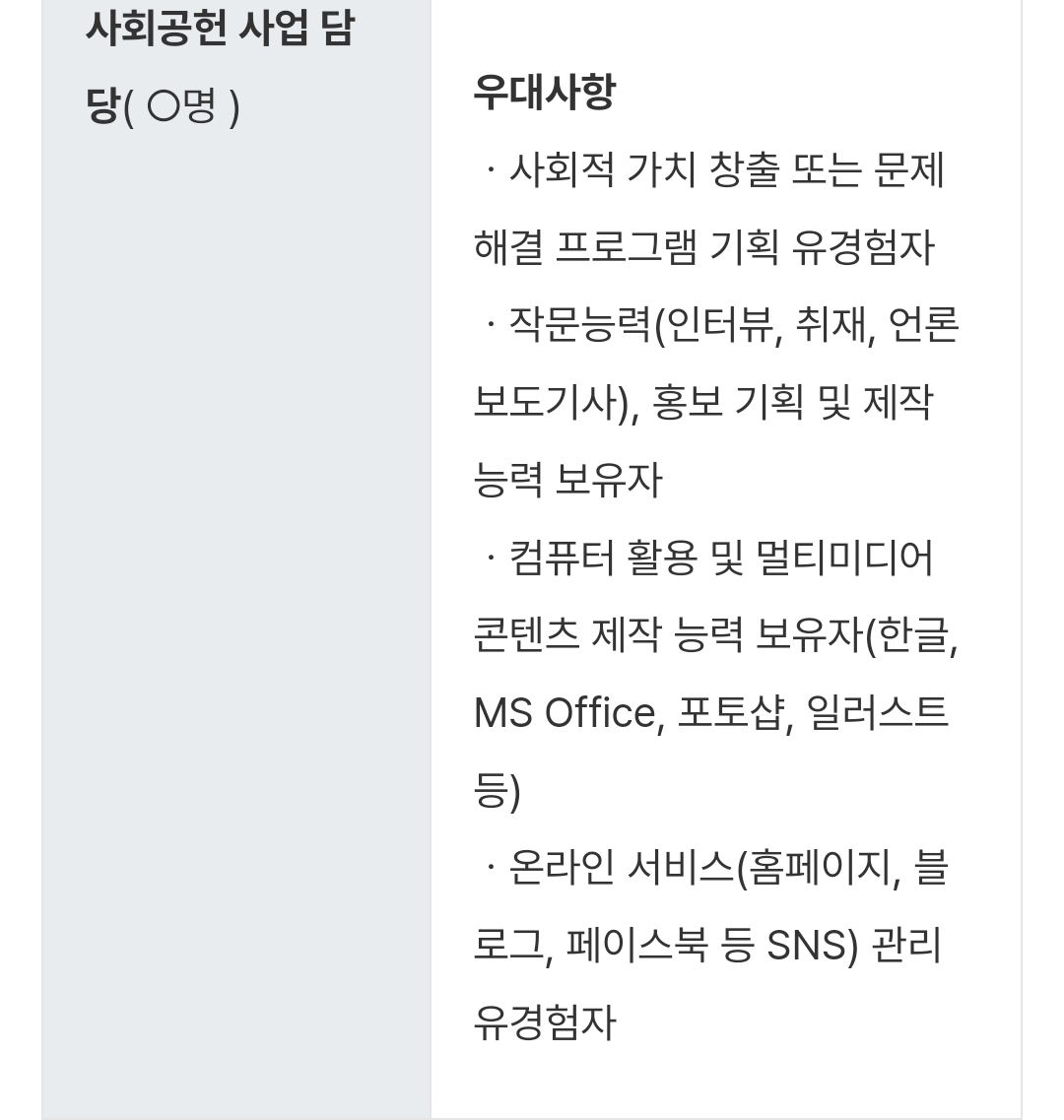 기업 사회공헌 업무 분야로 취업하기는 쉽지 않다. 자리도 많지 않고 정규직이 아닌 계약직인 경우가 많다. 기존 직원들이 사회공헌 업무를 담당하는 경우가 많아 사회복지사를 채용하는 경우가 적다. 또한 채용 경우에도 사회공헌이나 기업과 연관된 업무 경력자를 우선한다. 따라서 최대한 많은 경험을 쌓을수 있도록 준비해야 한다. 이에 기업 사회공헌 분야 채용 사례를 엄선해서 공유하고자 한다.