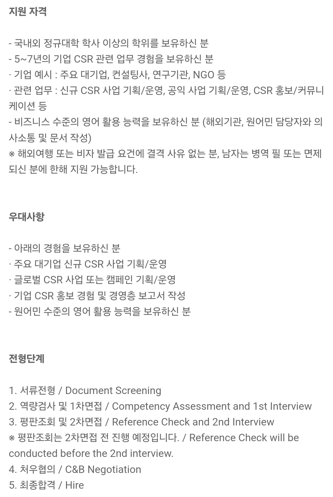 기업 사회공헌 업무 분야로 취업하기는 쉽지 않다. 자리도 많지 않고 정규직이 아닌 계약직인 경우가 많다. 기존 직원들이 사회공헌 업무를 담당하는 경우가 많아 사회복지사를 채용하는 경우가 적다. 또한 채용 경우에도 사회공헌이나 기업과 연관된 업무 경력자를 우선한다. 따라서 최대한 많은 경험을 쌓을수 있도록 준비해야 한다. 이에 기업 사회공헌 분야 채용 사례를 엄선해서 공유하고자 한다.