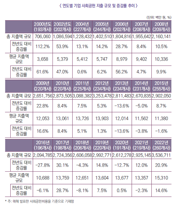 이후 점진적인 증감을 지속하다 2022년 260개 기업이 조사에 참여하여 35,367억원 즉 3조원 이상의 규모로 기업이 사회에 기부하고 있는 것으로 조사되었다.