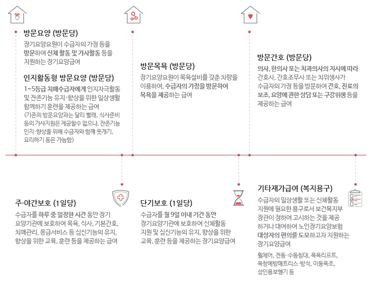 ○급여대상 ; 우리나라 장기요양보험제도는 65세 이상의 노인 또는 65세 미만의 자로서 치매ㆍ뇌혈관성 질환 등 노인성질병을 가진자중 6개월 이상 혼자서 일상생활을 수행하기 어렵다고 인정되는 자를 그 수급대상자로 하고 있다. 여기에는 65세 미만자의 노인성질병이 없는 일반적인 장애인은 제외되고 있다.