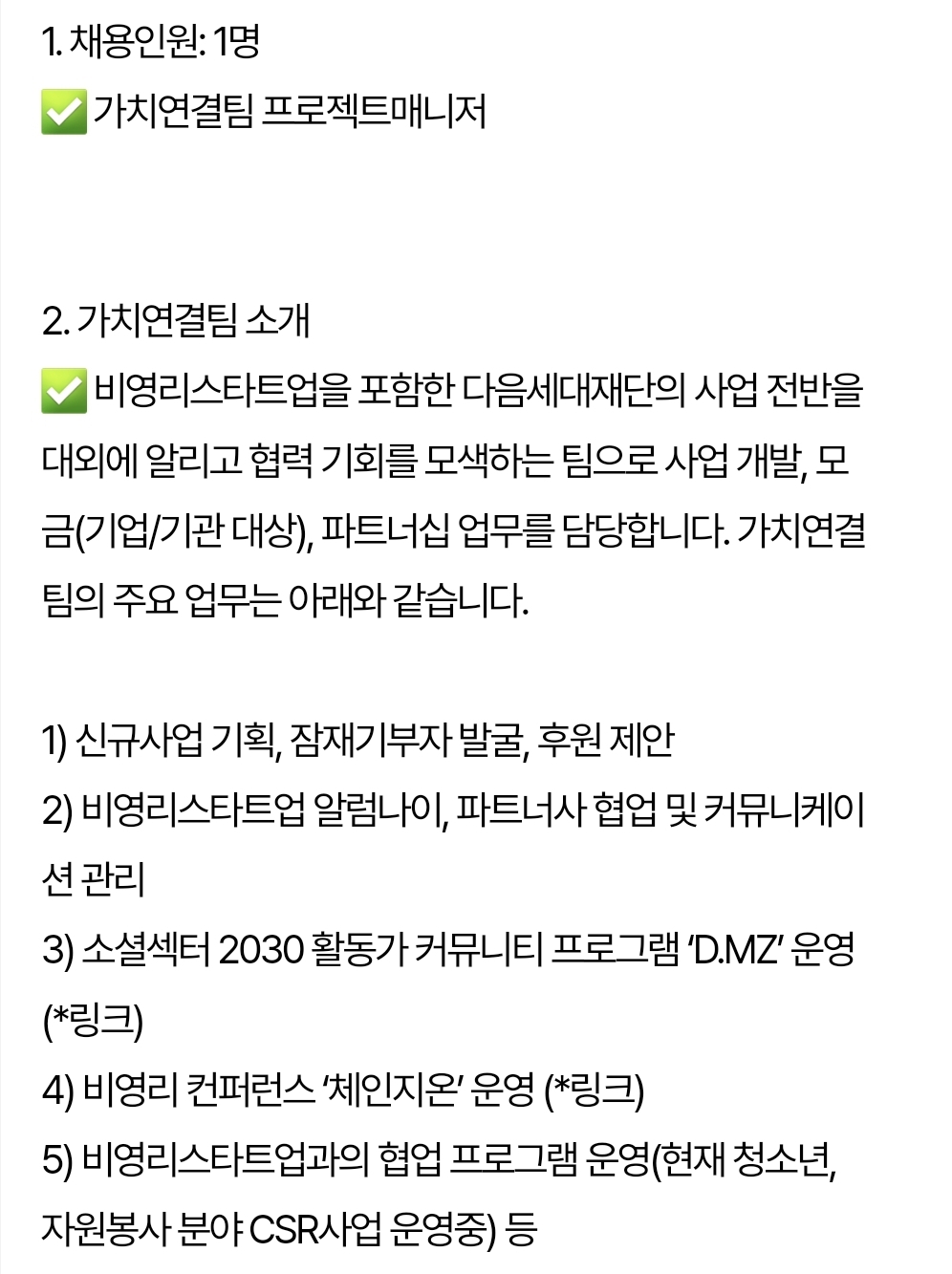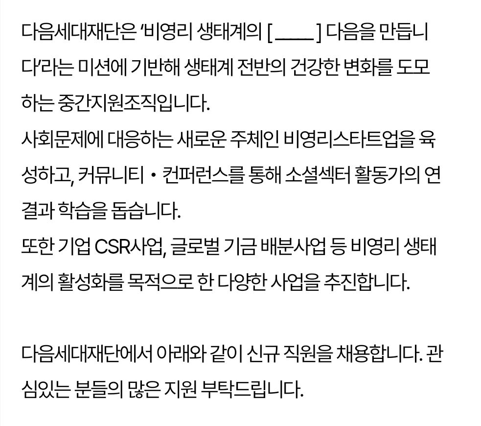 기업 사회공헌 업무 분야로 취업하기는 쉽지 않다. 자리도 많지 않고 정규직이 아닌 계약직인 경우가 많다. 기존 직원들이 사회공헌 업무를 담당하는 경우가 많아 사회복지사를 채용하는 경우가 적다. 또한 채용 경우에도 사회공헌이나 기업과 연관된 업무 경력자를 우선한다. 따라서 최대한 많은 경험을 쌓을수 있도록 준비해야 한다. 이에 기업 사회공헌 분야 채용 사례를 엄선해서 공유하고자 한다.