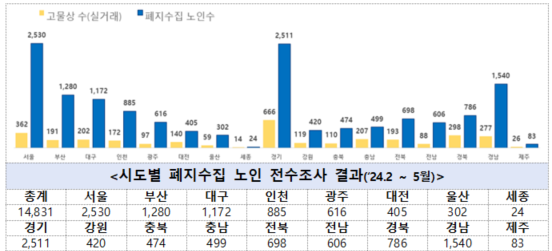 전수조사결과 전국 229개 시군구 폐지수집 노인은 14,831명으로 집계되었으며, 서울특별시 2,530명, 경기도 2,511명, 경상남도 1,540명 순으로 활동인원이 많았다.