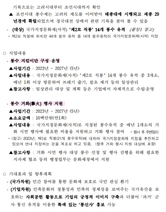 문화재청과 문화재지킴이 후원 협약을 체결하고 봉수 개보수 및 관리를 위한 후원과 임직원 고객참여 지킴이 봉사 활동을 연계할 수 있는 프로그램이라고 생각됨. 기부와 참여를 병행할 수 있는 제안 프로그램 임.