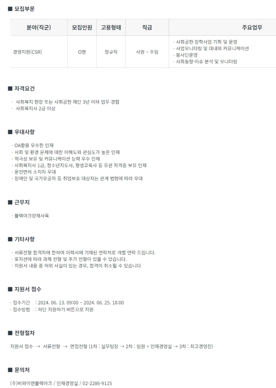 기업 사회공헌 업무 분야로 취업하기는 쉽지 않다. 자리도 많지 않고 정규직이 아닌 계약직인 경우가 많다. 기존 직원들이 사회공헌 업무를 담당하는 경우가 많아 사회복지사를 채용하는 경우가 적다. 또한 채용 경우에도 사회공헌이나 기업과 연관된 업무 경력자를 우선한다. 따라서 최대한 많은 경험을 쌓을수 있도록 준비해야 한다. 이에 기업 사회공헌 분야 채용 사례를 엄선해서 공유하고자 한다.