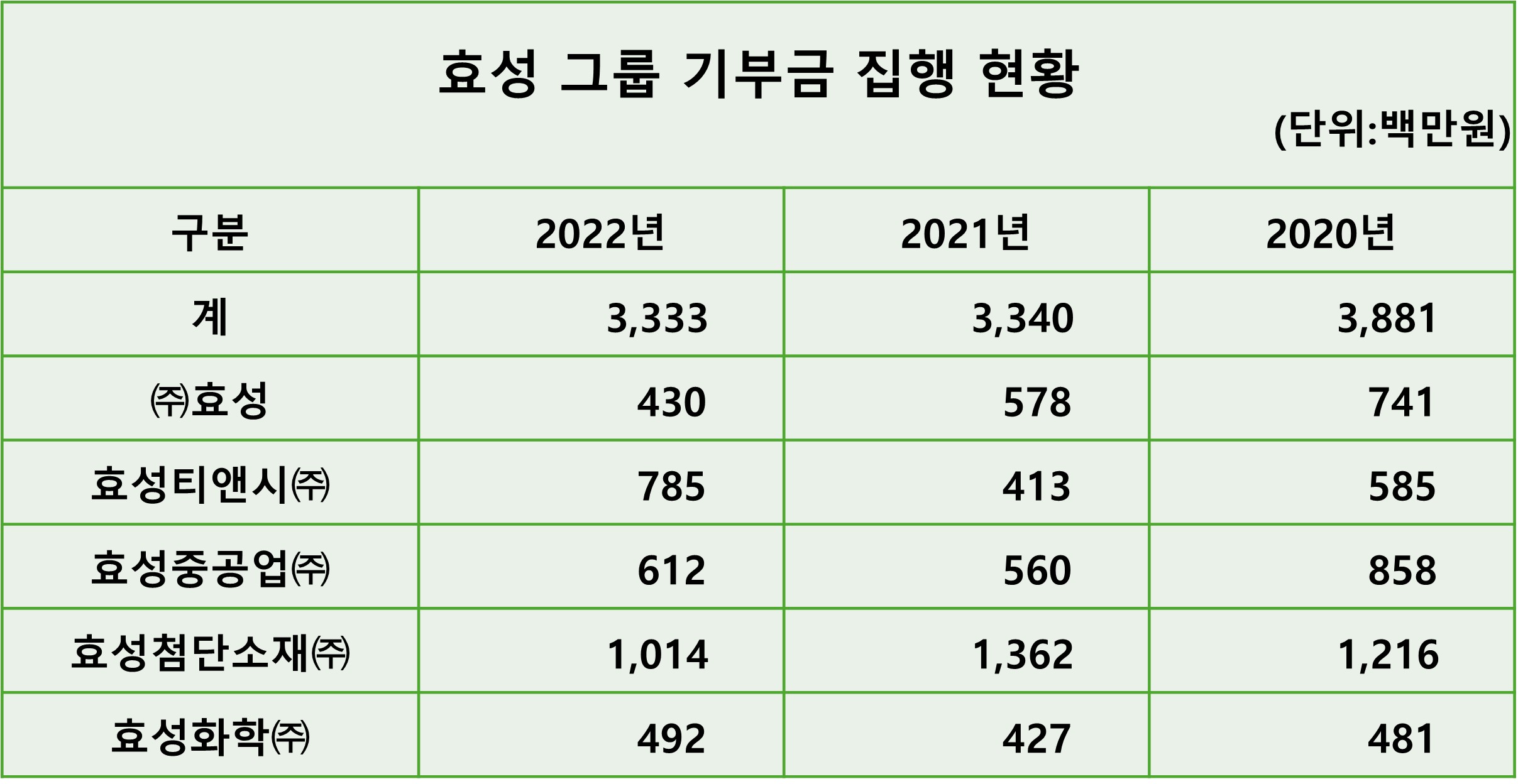 효성의 사회공헌 활동은 다 함께 행복한 사회를 만드는 데 보탬이 되겠다는 가치의 실천이다. 임직원의 자발적인 참여를 통해 2013년부터 효성나눔봉사단을 운영하고 있다.장애어린이 재활치료 및 장애어린이 가족 후원, 취약계층 여성 취업 활성화를 위한 교육 후원, 일자리창출 사회적기업 후원, 사업장별 지역 나눔 활동 등의 국내 활동뿐만 아니라 베트남 무료 진료사업 효성미소원정대, 임직원의 베트남 해외아동 결연사업, 아프리카 르완다 여아 보건증진 및 위생용품 지원 사업 등의 해외 활동도 진행하고 있다.