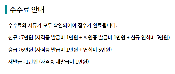 총 7만원(자격증 발급수수료 1만원, 회원증 발급수수료 1만원, 연회비 5만원)