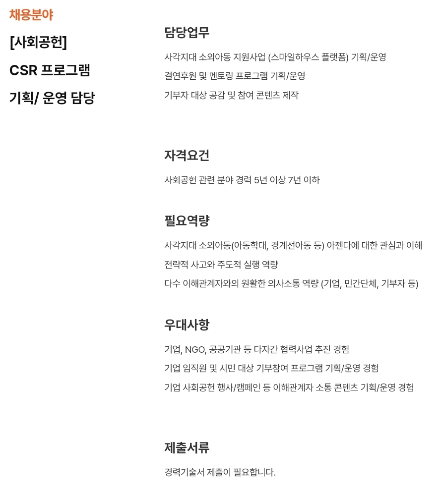 기업 사회공헌 업무 분야로 취업하기는 쉽지 않다. 자리도 많지 않고 정규직이 아닌 계약직인 경우가 많다. 기존 직원들이 사회공헌 업무를 담당하는 경우가 많아 사회복지사를 채용하는 경우가 적다. 또한 채용 경우에도 사회공헌이나 기업과 연관된 업무 경력자를 우선한다. 따라서 최대한 많은 경험을 쌓을수 있도록 준비해야 한다. 이에 기업 사회공헌 분야 채용 사례를 엄선해서 공유하고자 한다.