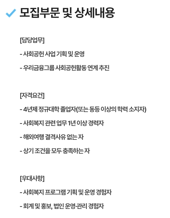 기업 사회공헌 업무 분야로 취업하기는 쉽지 않다. 자리도 많지 않고 정규직이 아닌 계약직인 경우가 많다. 기존 직원들이 사회공헌 업무를 담당하는 경우가 많아 사회복지사를 채용하는 경우가 적다. 또한 채용 경우에도 사회공헌이나 기업과 연관된 업무 경력자를 우선한다. 따라서 최대한 많은 경험을 쌓을수 있도록 준비해야 한다. 이에 기업 사회공헌 분야 채용 사례를 엄선해서 공유하고자 한다.
