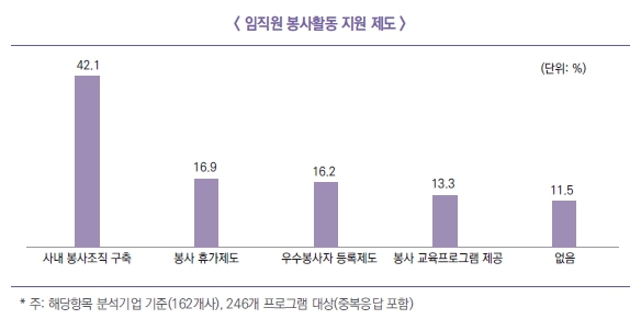 응답기업 162개사 중 중복응답을 포함하여 사내봉사조직 구축이 42.1%로 나타났으며, 봉사 휴가제도 16.9%, 봉사자 등록제도 16.2%, 교육프로그램 제공 13.3%로 나타났다. 다른 한편으로는 제도가 없는 경우도 11.5%로 나타났다.