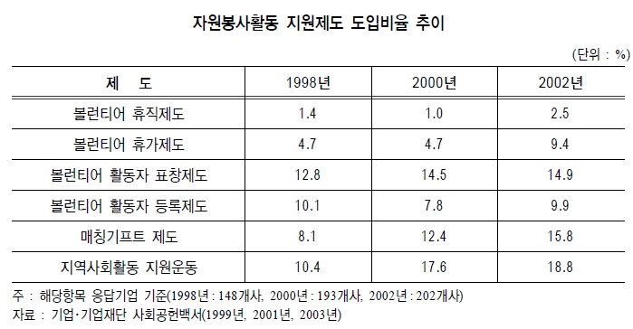 20여년 전인 2005년 전경련 사회공헌백서 자료에 따르면 기업의 자원봉사 활동 지원제도 도입 비율이 다음과 같이 나타났다.