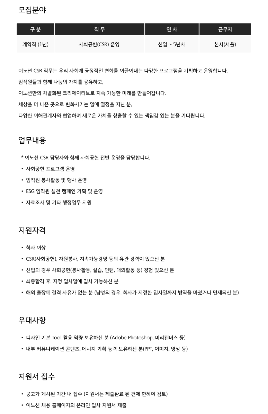 기업 사회공헌 업무 분야로 취업하기는 쉽지 않다. 자리도 많지 않고 정규직이 아닌 계약직인 경우가 많다. 기존 직원들이 사회공헌 업무를 담당하는 경우가 많아 사회복지사를 채용하는 경우가 적다. 또한 채용 경우에도 사회공헌이나 기업과 연관된 업무 경력자를 우선한다. 따라서 최대한 많은 경험을 쌓을수 있도록 준비해야 한다. 이에 기업 사회공헌 분야 채용 사례를 엄선해서 공유하고자 한다.