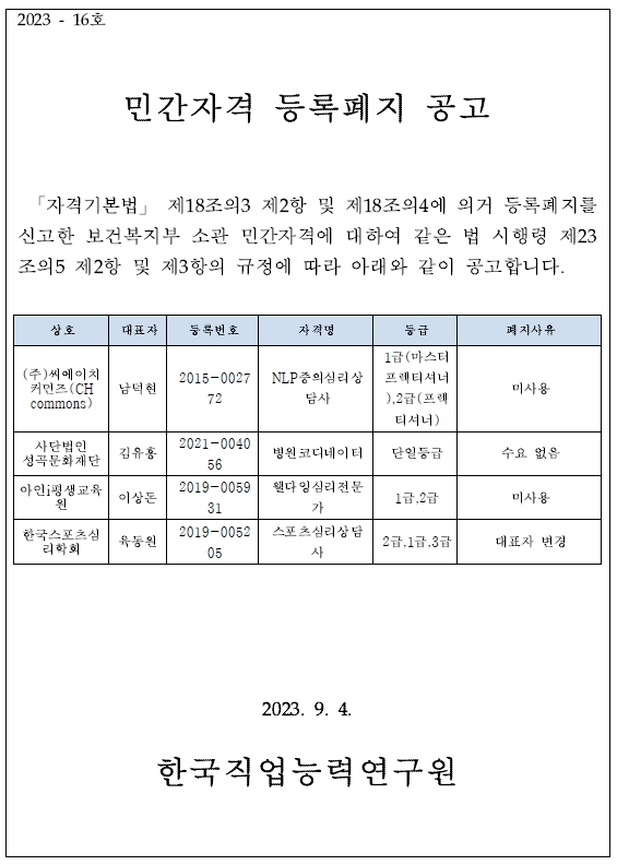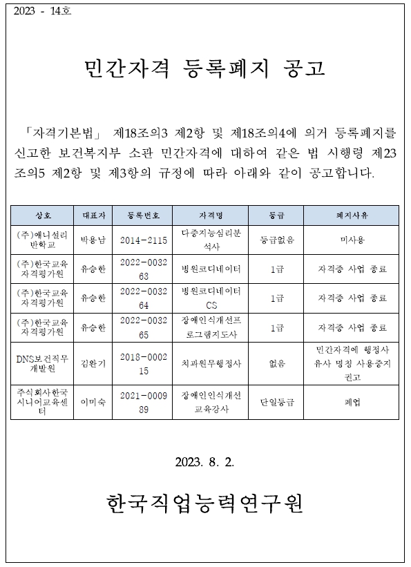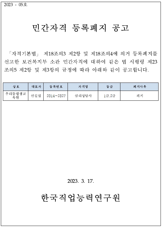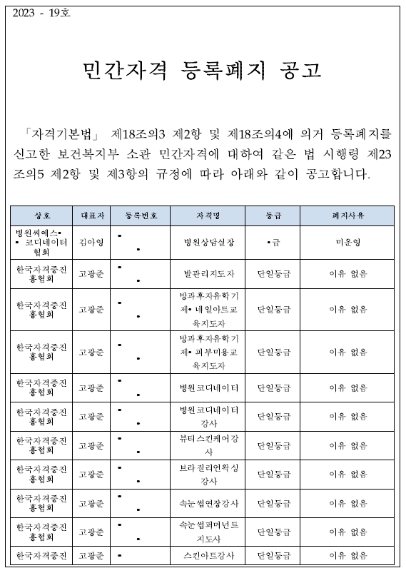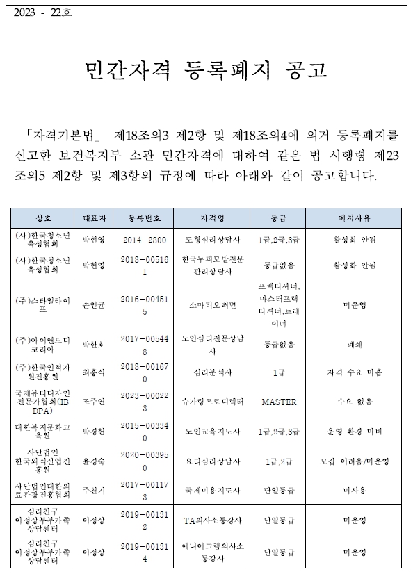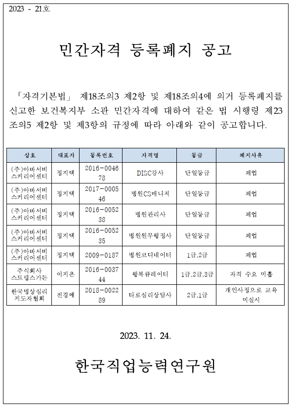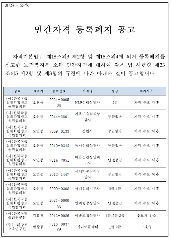 | 2024년 민간자격 등록폐지 공고(4/7기준) (0) | 2024.04.09 |