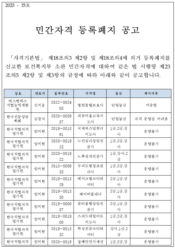 2024년 민간자격 등록폐지 공고(4/7기준) (0) | 2024.04.09 |