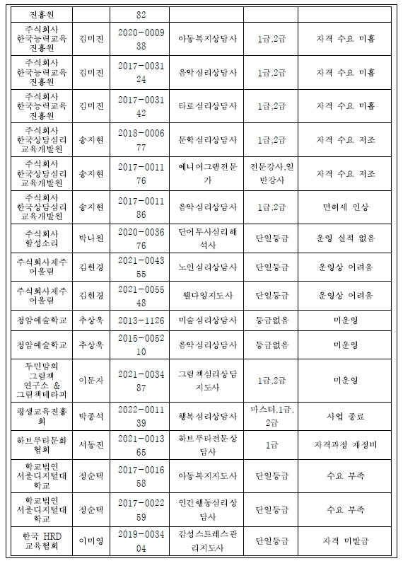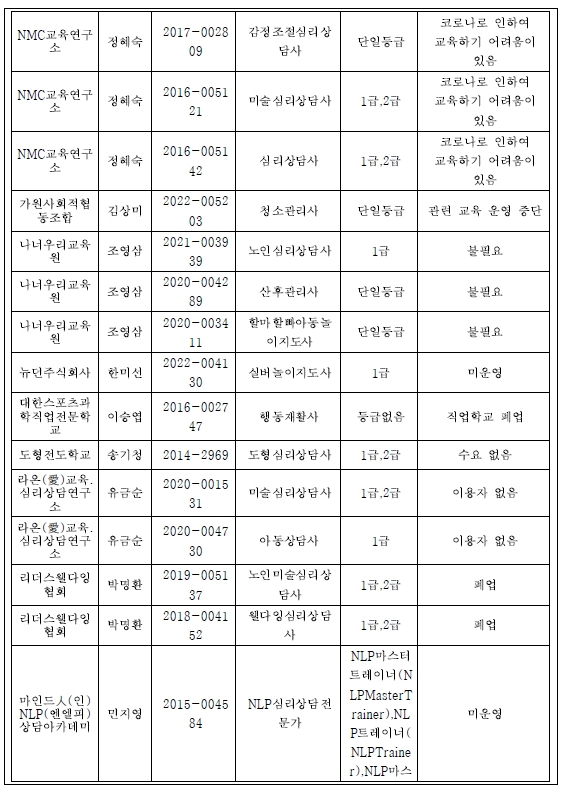 사회복지에 관심이 있는 일반 시민들이나 사회복지사 중에서도 취업이나 진로에 필요한 자격증 수요로 인해 복지분야 관련 많은 민간 자격증 취득을 고려하거나 시행한 경우가 많다. 그러나 사회복지 분야의 국가 자격증이 아닌 민간자격증은 현장에서 인정되지 않으며, 수많은 업체들에서는 민간자격을 만들었다 폐지하는 등 일반 시민들의 피해가 지속되고 있다. 이에 「자격기본법」제18조의3 제2항 및 제18조의4에 의거 등록폐지를 신고한 보건복지부 소관 민간자격에 대하여 같은 법 시행령 제23조의5 제2항 및 제3항의 규정에 따라 아래와 같이 공고된 사항을 게시합니다.