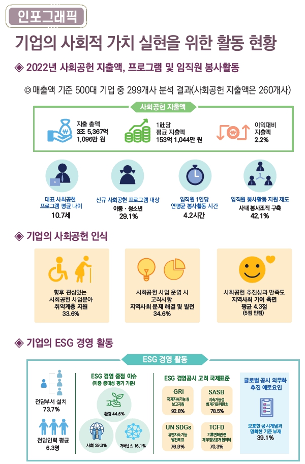 한국경제인연합회에서 2024년 1월 발간한 “2023 주요 기업의 사회적 가치 보고서”에 따르면, 2022년 주요 기업 260개사가 지출한 사회공헌 비용은 총 3조 5,367억원으로 평균 153억원으로 조사되었다. 매출액 대비 사회공헌 지출 비율은 0.12%, 세전이익 대비 사회공헌 지출 비율은 2.2%로 나타났다. 분야별로는 ‘취약계층 지원’에 대한 지출 비중(25.5%)이 가장 높았으며, 이어 ‘교육·학교·학술’(16.3%), ‘문화예술·체육’(13.6%), ‘지역경제 활성화’(13.2%) 순으로 나타났다.