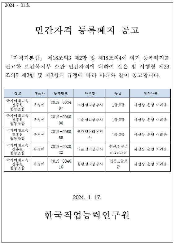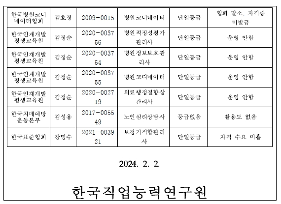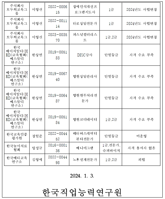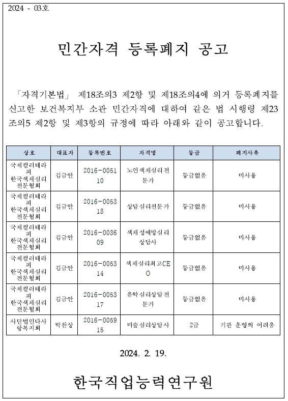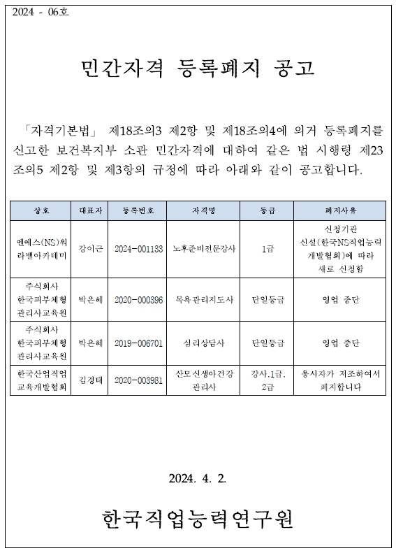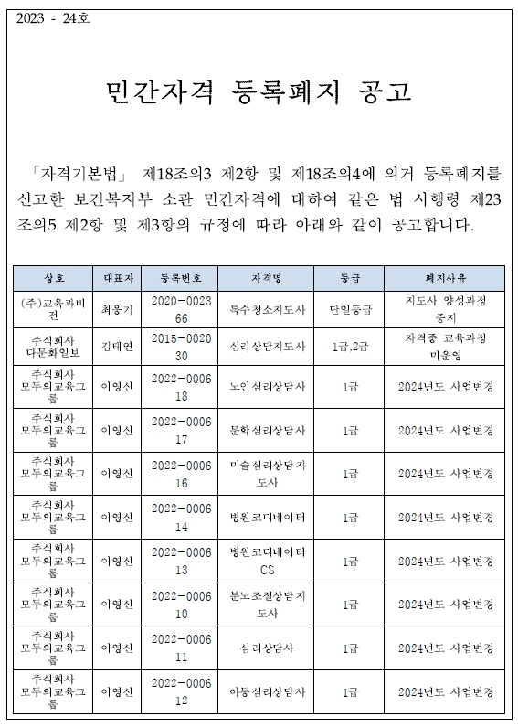 | 2023년 민간자격 등록폐지(250개소) 공고 (0) | 2024.04.09 |