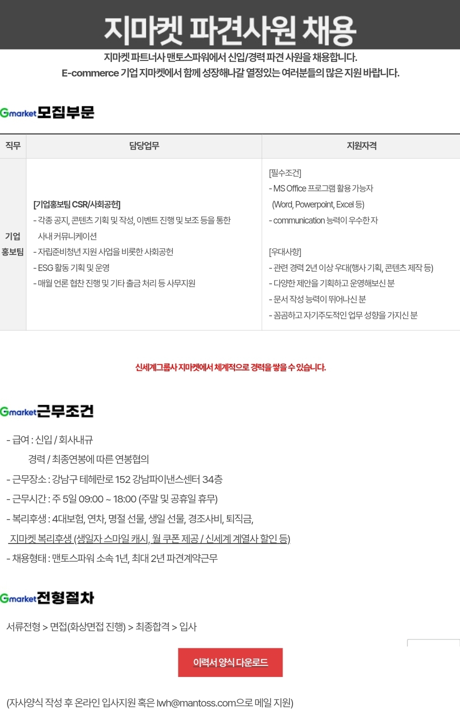 ※아래 채용 사항은 헤드헌팅 회사 소속으로 지마켓에 파견되어 일하는 형태임